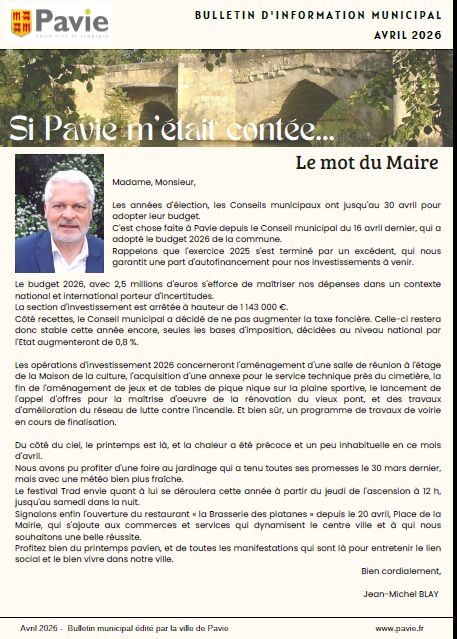 Actualités...Plan Local d'Urbanisme : Procédure de modification simplifiée n°3 Mise à disposition du dossier au public du 15/01 au 15/02/2025. Lien vers le dossier :https://www.grandauch.com/modification-plu-pavie |